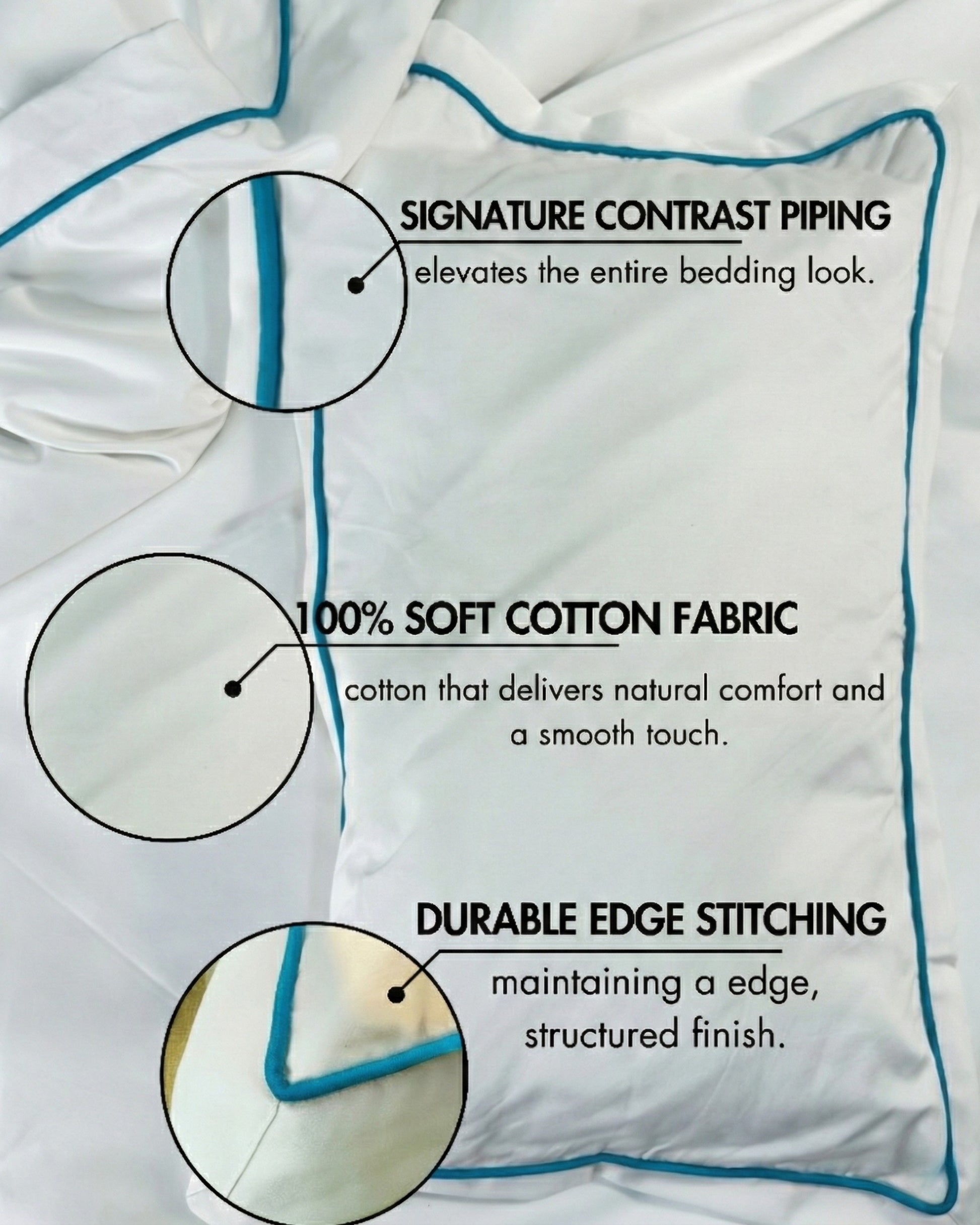 Precision-tailored integrated piping enhances the duvet set with a clean structured hotel-style luxury appearance.